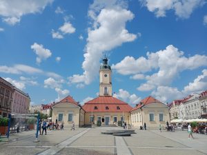 Wprawdzie Białystok i Siedlce dzieli 150 kilometrów, ale ratusze, stojące w tych miastach wykazują duże podobieństwo do siebie. Choć oba powstały w XVIII wieku, jednak zaprojektowali je różni architekci – włoski w pierwszym wypadku i polski w drugim. I ten białostocki – fotografia 1 i siedlecki[ fot. 2] mają zbliżone założenie: w środku jest wieża, a po bokach oficyny służące za kramy.