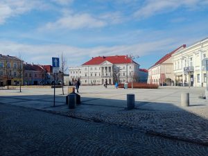 Czym mnie urzekł rynek w stolicy województwa świętokrzyskiego? Nieregularnym kształtem[ zapomnij o kwadracie czy prostokącie, mysl o trapezie] i jakąś taką spokojną urodą. No i podcieniami, neobarokowym ratuszem i .. spokojem.